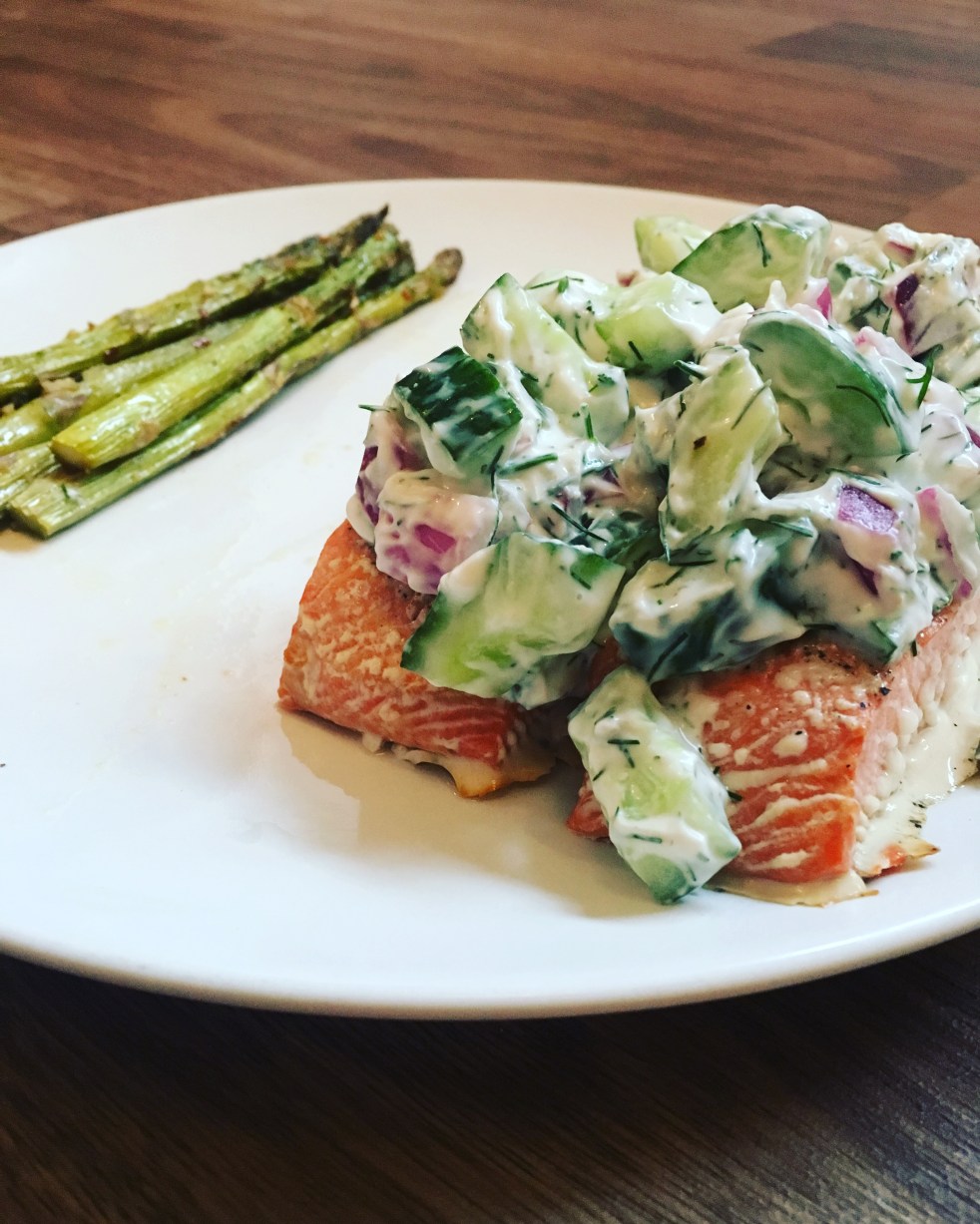 4. Once your salmon is finished, top it with the cucumber dill salad & enjoy